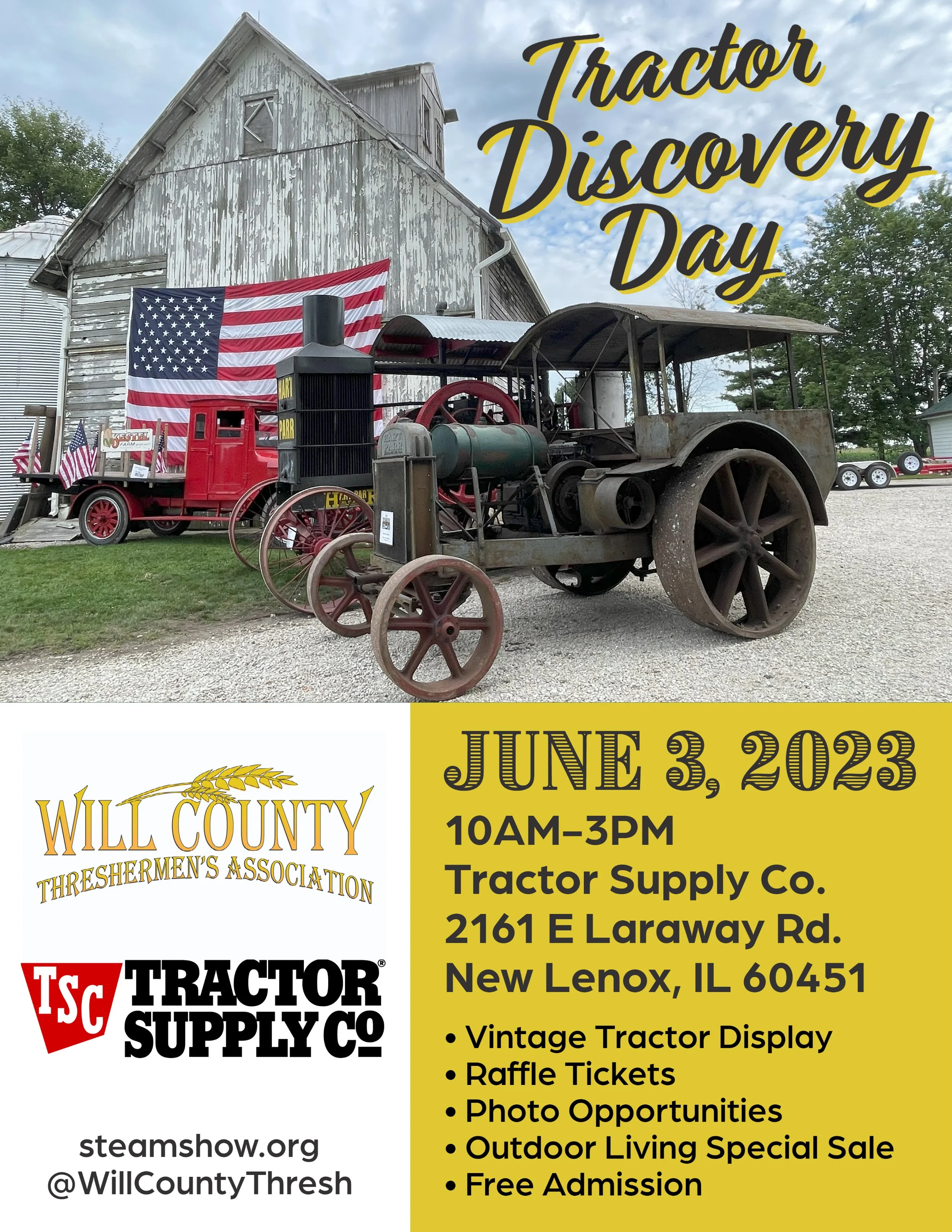 [New Lenox, IL] - The Will County Threshermen's Association (WCTA) invites you to Tractor Discovery Day on June 3rd, 2023, from 10am to 3pm at Tractor Supply Co. (2161 E Laraway Rd. New Lenox, IL 60451).